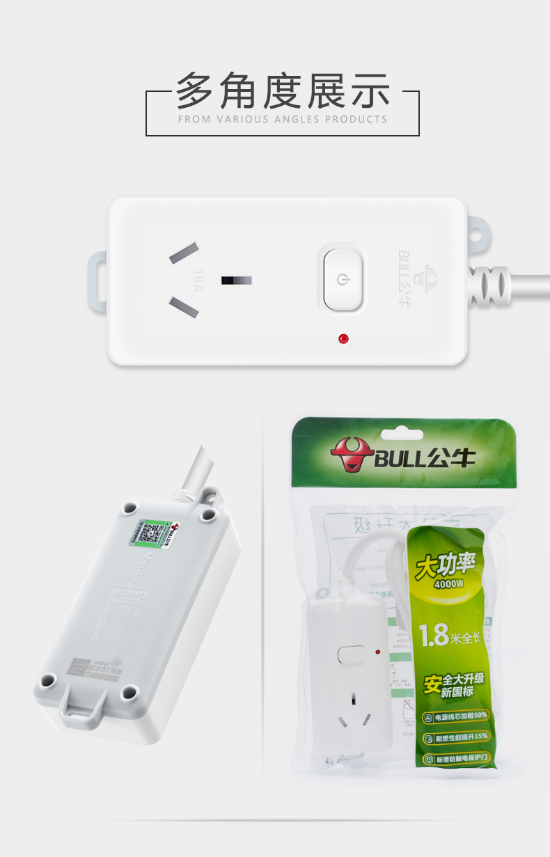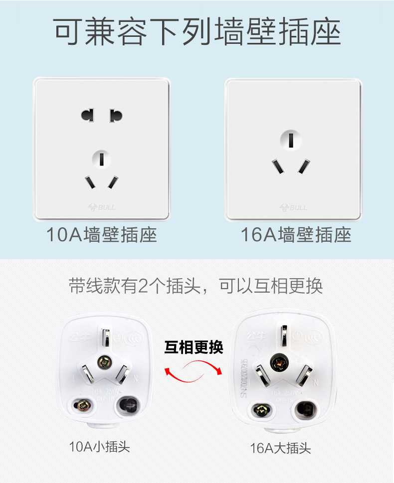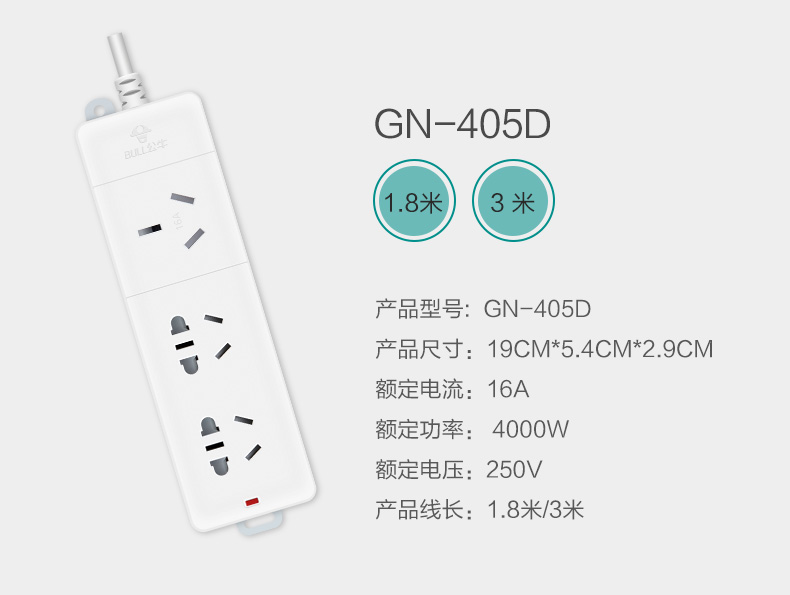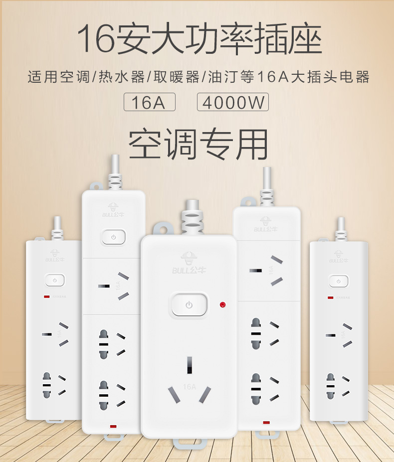 公牛16A空調(diào)專用插座電暖器插板加長延長線4000W大功率插排油汀插線板接線板排插16安大孔拖線板 5米3插位GN-406D【送10A插頭】