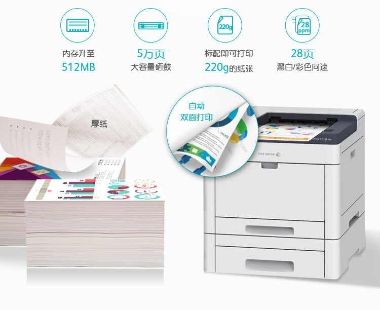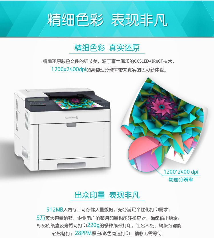 A4彩色,黑白彩色同速28PPM,1200X2400dpi,512MB內(nèi)存,標(biāo)配網(wǎng)絡(luò)打印,標(biāo)配雙面打印,首頁(yè)輸出彩色9.2秒,黑白8.2秒