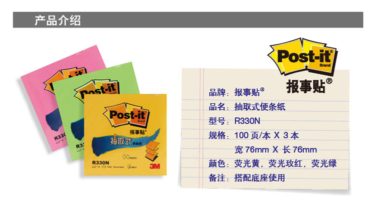 3M報事貼 R330N 抽取式便簽紙報事貼N次貼 76*76mm 粉色 單位:12本/包