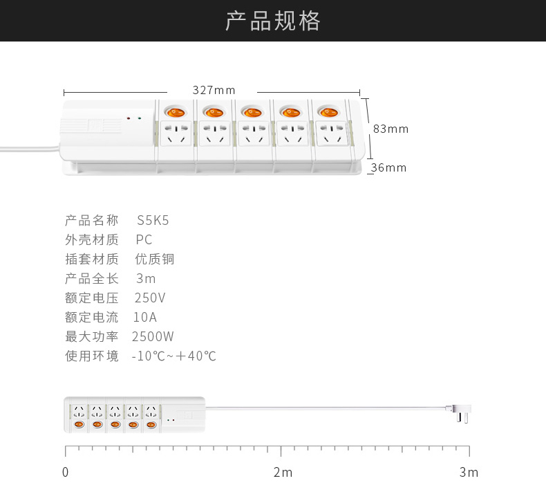 突破插座 S5K5 5位分控獨立開關(guān) 3米 單位:個