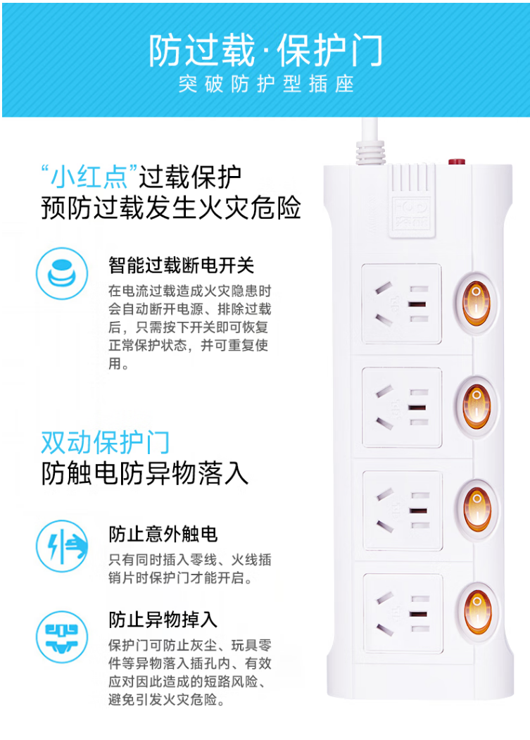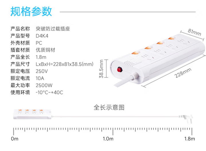 突破插座 TZ-D4K4 1.8米4開4位插線板 單位:個(gè)