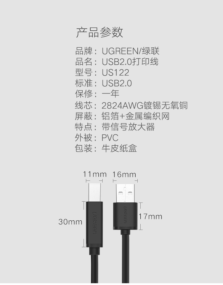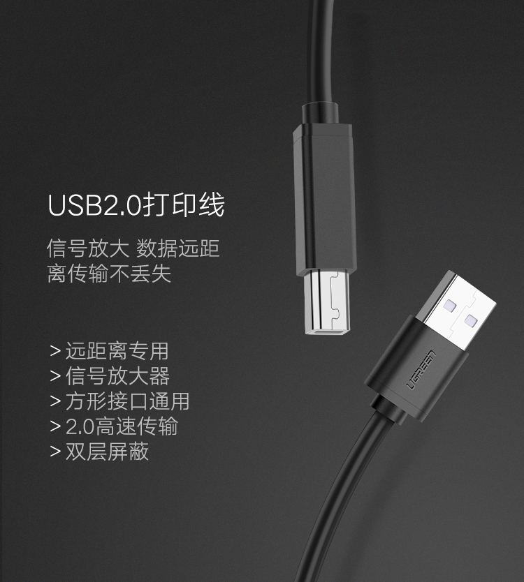 綠聯(lián) US122 打印機(jī)數(shù)據(jù)線 高速USB2.0方口連接線AM/BM 帶信號放大器 15米 黑色 單位:根