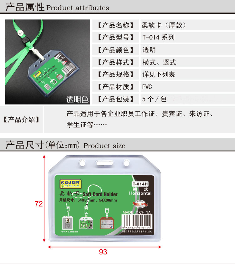科記 厚款柔軟卡套T-014H橫 不配繩 5個/包 單位:包