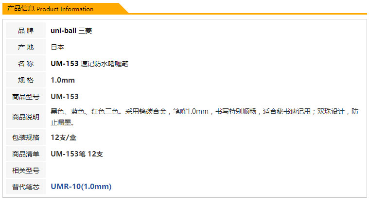 三菱 UM-153 1.0mm防水速記中性筆/簽字筆 藍(lán)色 12支/盒