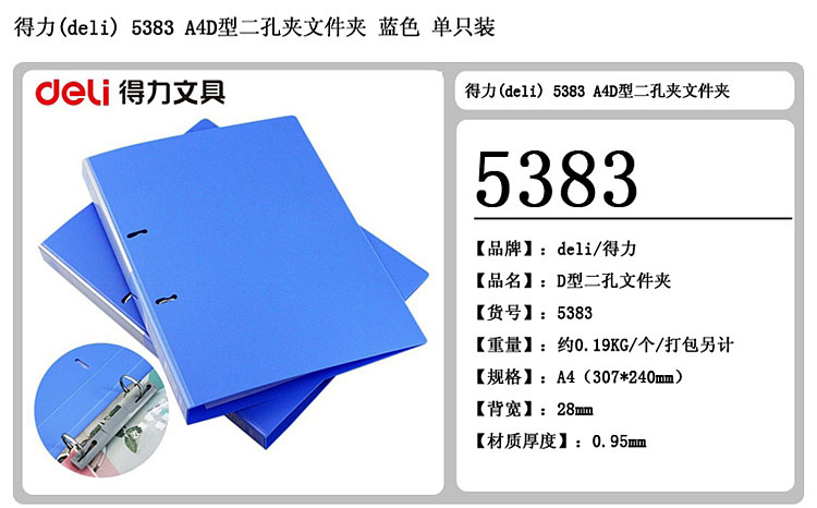 得力(deli) 5383 A4D型二孔夾文件夾 藍色 單只裝