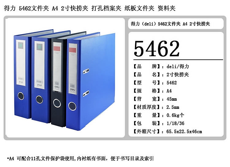 得力(deli)5462 A4快勞夾文件夾兩孔夾活頁打孔文件夾單只裝2孔 背寬45mm