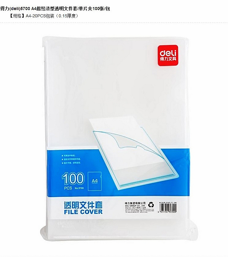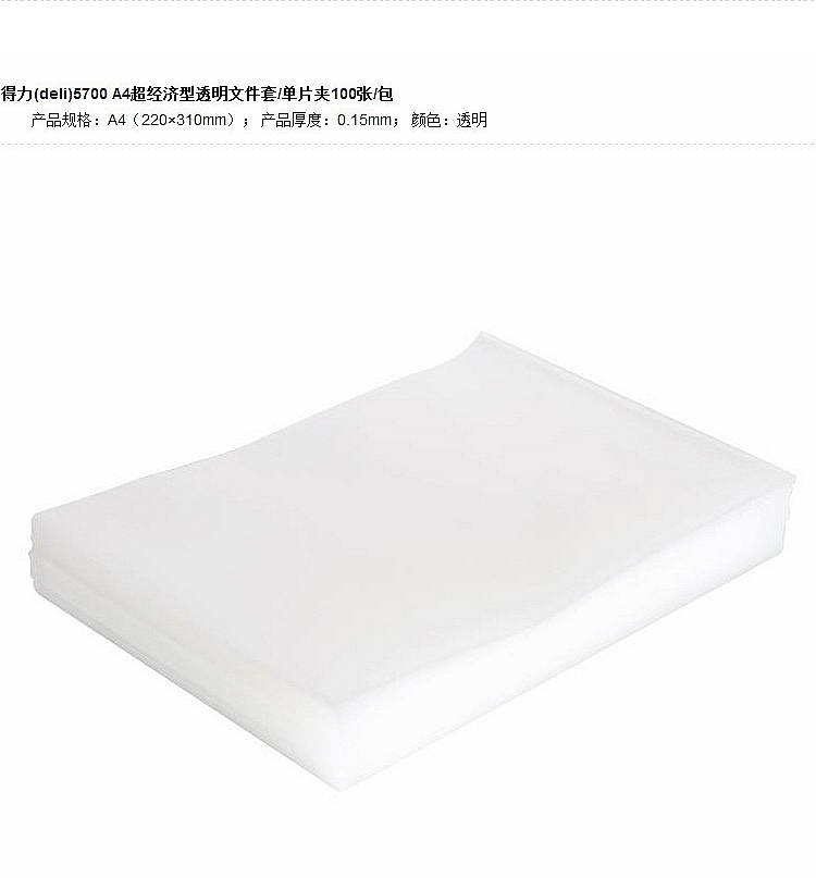 得力(deli) 5700 A4經(jīng)濟(jì)型透明文件套/單片夾0.15mm 100張/包
